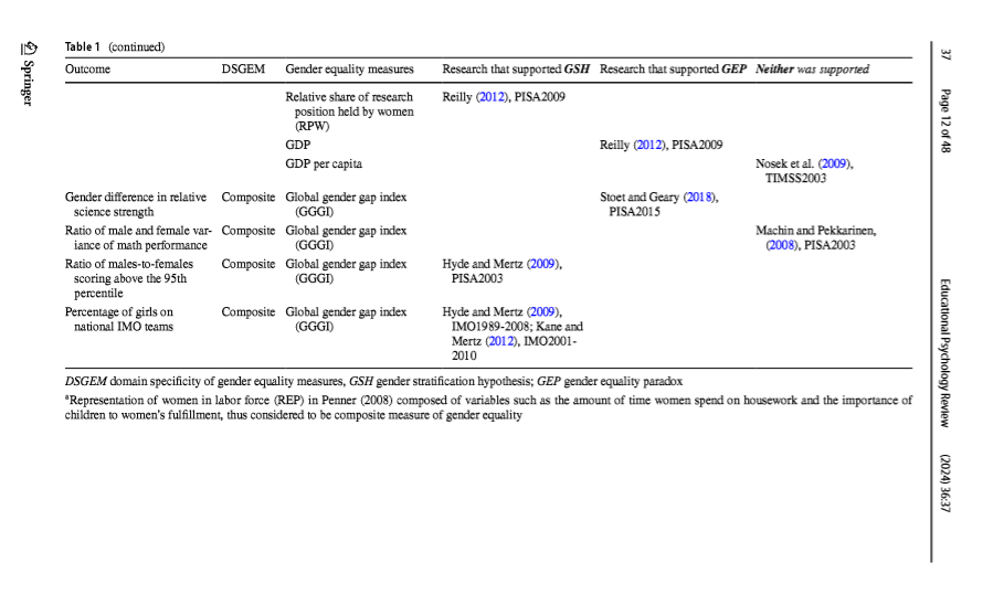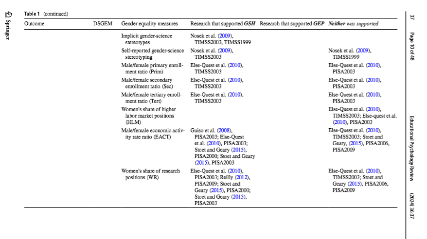 [2] "(2010),\n                                                                                                                                                            Educational Psychology Review\n\n\n\n\n                                     positions (WR)                  PISA2003; Reilly (2012),                                TIMSS2003; Stoet and\n                                                                     PISA2009; Stoet and                                     Geary (2015), PISA2006,\n                                                                     Geary (2015), PISA2000;                                 PISA2009\n                                                                     Stoet and Geary (2015),\n                                                                     PISA2003\n                                                                                                                                                            (2024) 36:37\n\n     Table 1  (continued)\n     Outcome                        DSGEM      Gender equality measures       Research that supported GSH Research that supported GEP Neither was supported\n\n                                               Women’s share of parliamen- Else-Quest et al."