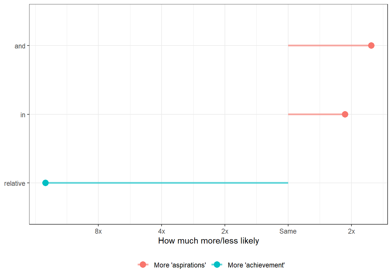 La idea de la relación logarítmica muestra la probabilidad de que aparezca una palabra en comparación con su contraparte (por lo que “aspirations (algo)” tiene aproximadamente 5 más probabilidades de aparecer que “achievement (algo)”. En este gráfico, reemplazamos las etiquetas del eje x con “2x” y “4x”, pero sin ellos, se obtienen números como 1, 2 y 3 (o -1, -2, -3)). Para convertir esos números de razones registradas a la versión multiplicativa (es decir, 2x en lugar de 1), eleva 2 a la potencia de la razón logarítmica. Si la relación logarítmica es 3, la versión legible por humanos es 2^3, o sea 8 veces.