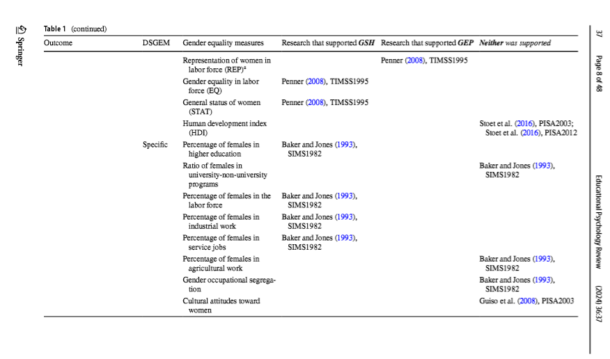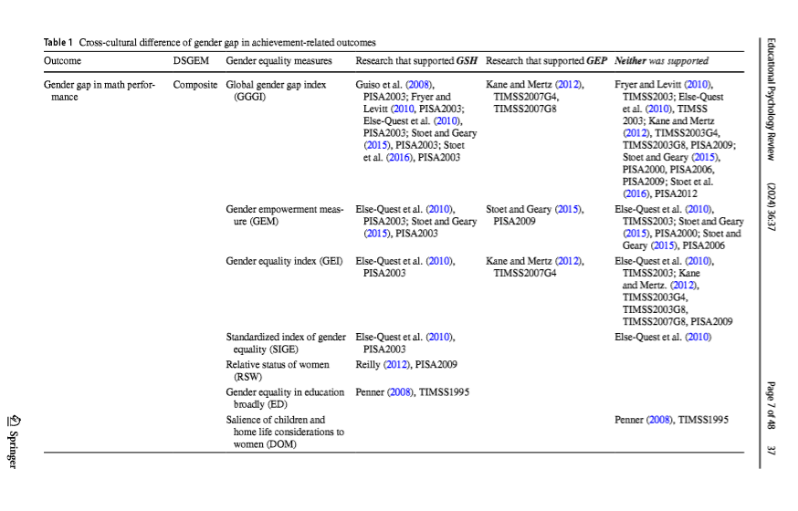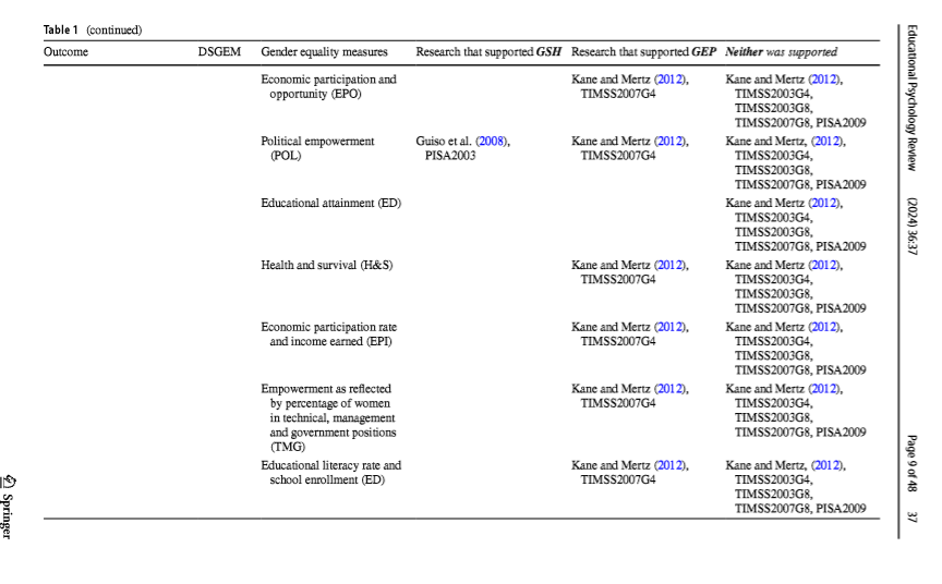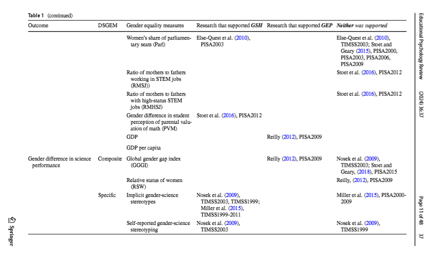 [2] "(2010),\n Educational Psychology Review\n\n\n\n\n positions (WR) PISA2003; Reilly (2012), TIMSS2003; Stoet and\n PISA2009; Stoet and Geary (2015), PISA2006,\n Geary (2015), PISA2000; PISA2009\n Stoet and Geary (2015),\n PISA2003\n (2024) 36:37\n\n Table 1 (continued)\n Outcome DSGEM Gender equality measures Research that supported GSH Research that supported GEP Neither was supported\n\n Women’s share of parliamen- Else-Quest et al."